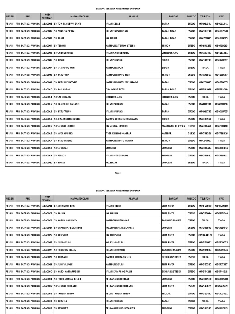 Bil Negeri Daerah Ppd Kod Sekolah Nama Sekolah Alamat Lokasi Bandar Poskod Lokasi No Telefon No Faks L P Enrolmen 1 Perak Ppd Batang Padang Aea0033